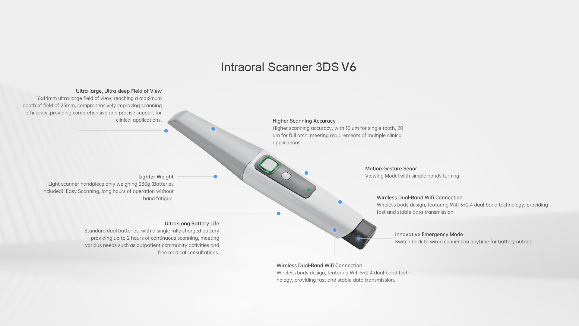 Light scanner handpiece only weighing 230g (Batteries included). Easy Scanning, long hours of operation without hand fatigue.