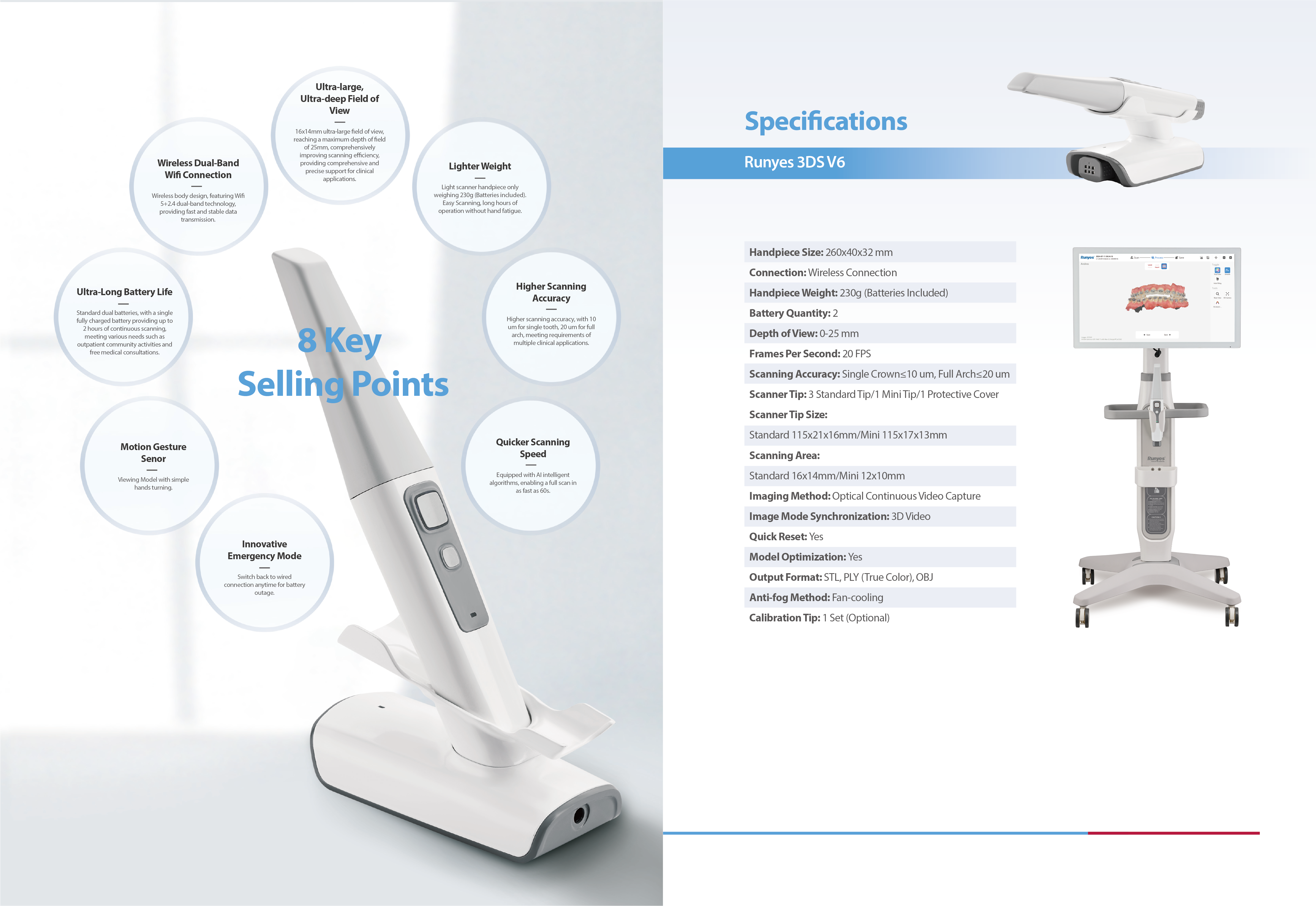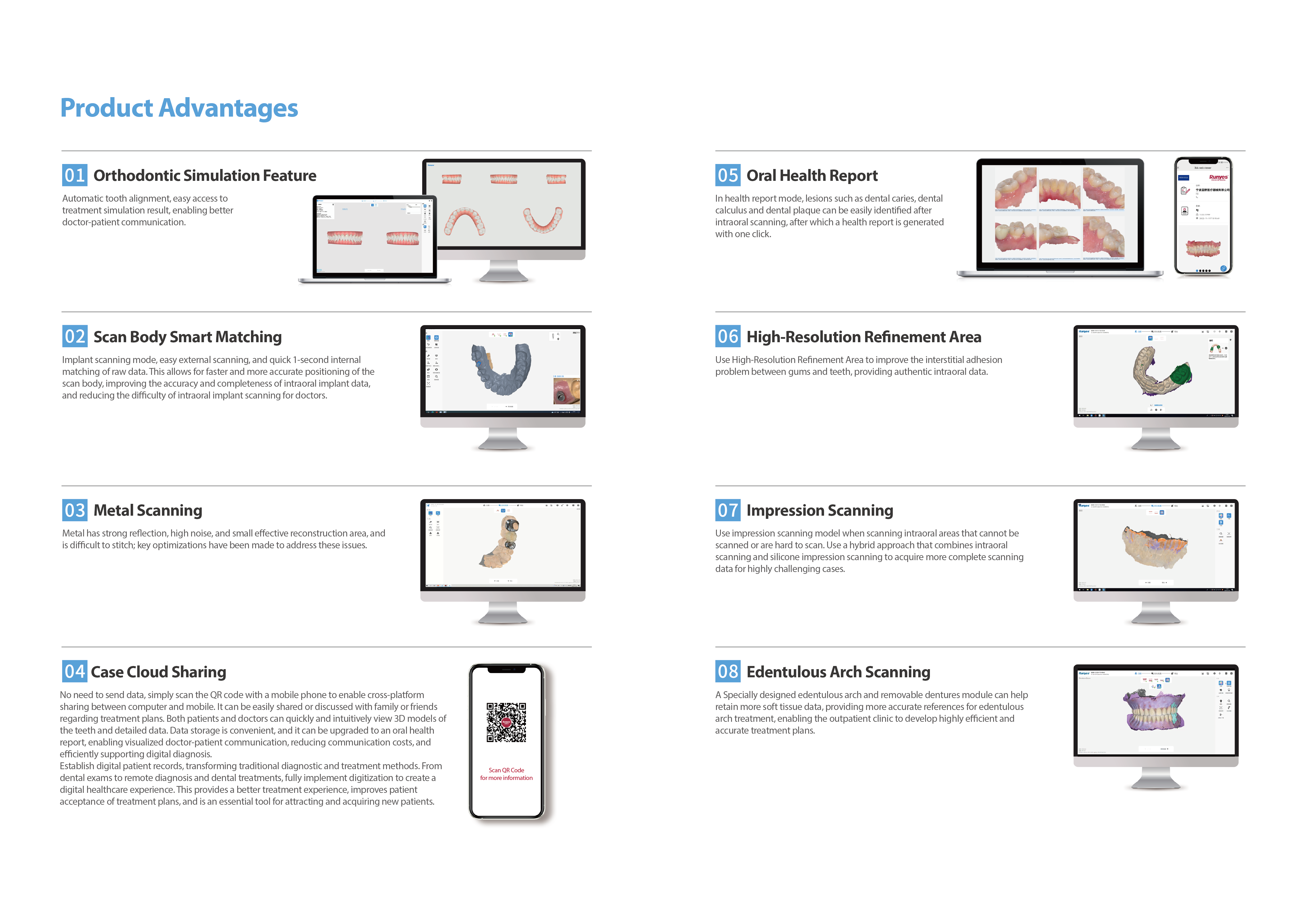 Higher scanning accuracy, with 10 um for single tooth, 20 um for full arch, meeting requirements of multiple clinical applications.