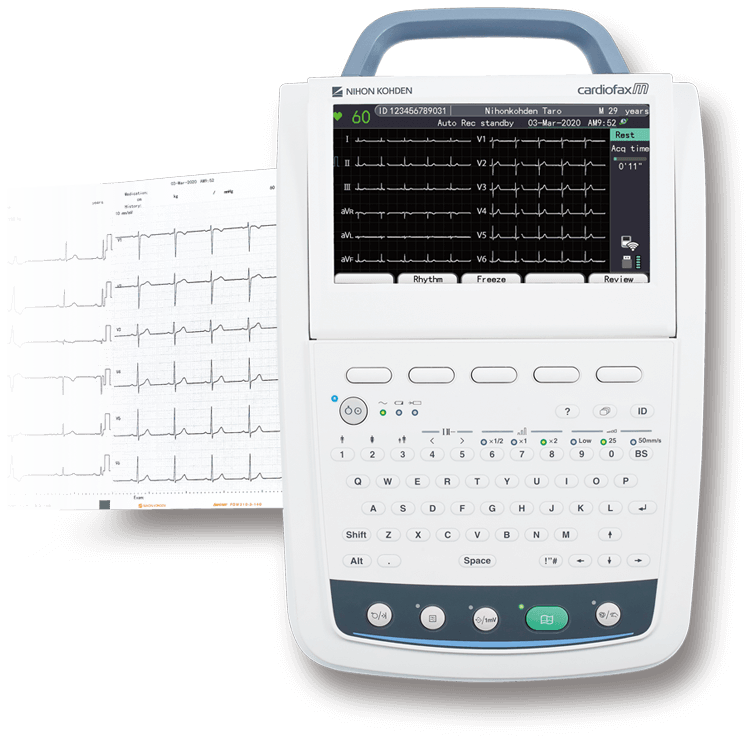 Easy operation and efficient workflow are the foundations of Nihon Kohden’s cardiofax M electrocardiogram. With its large 8.0-inch color display, data can be viewed easily and allows ECG preview before recording. cardiofax M supports paper-based and paperless workflows, enabling both waveform and analysis results to be transferred to a PC for review.