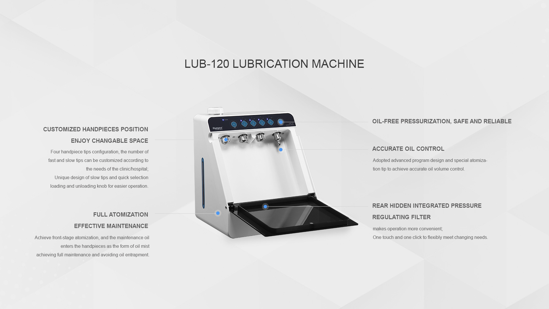 Achieve front-stage atomization, and the maintenance oil enters the handpieces as the form of oil mist achieving full maintenance and avoiding oil entrapment.