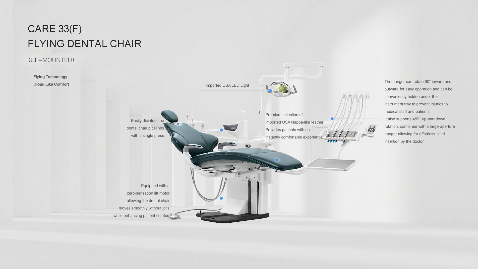 -Equipped with a zero-sensation lift motor allowing the dental chair moves smoothly without jolts while enhancing patient comfort