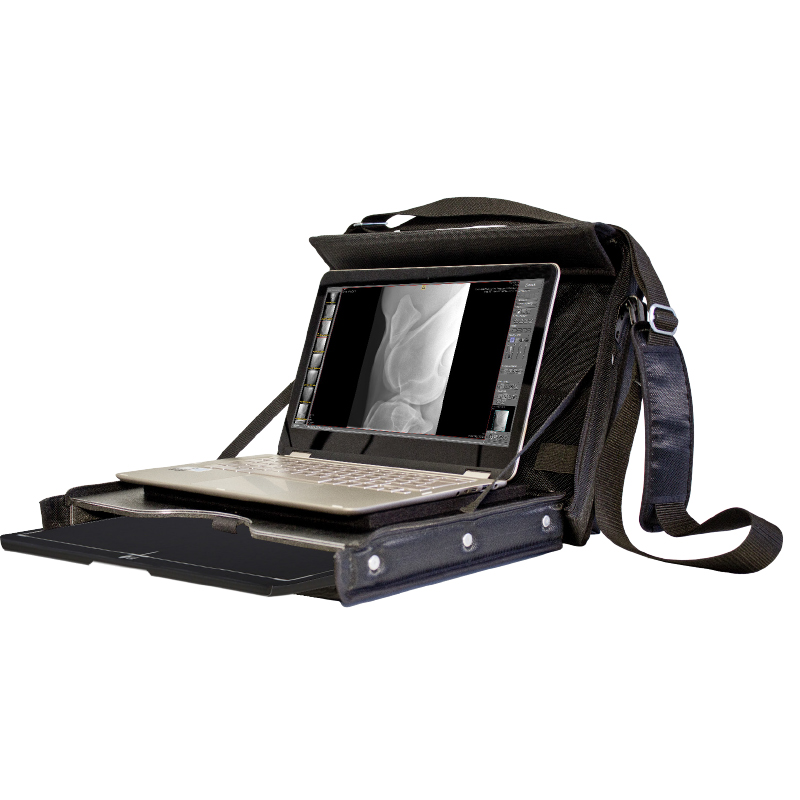 The compact and robust system bag suitable for the meX+1012 LGW offers enough space for a complete DR system. With an empty weight of just 2.4 kg, a padded shoulder strap and an additional handle, the bag is easy to transport. Accessories, documents, pens and much more can also be stored in the additional outer compartments and the inner pocket.