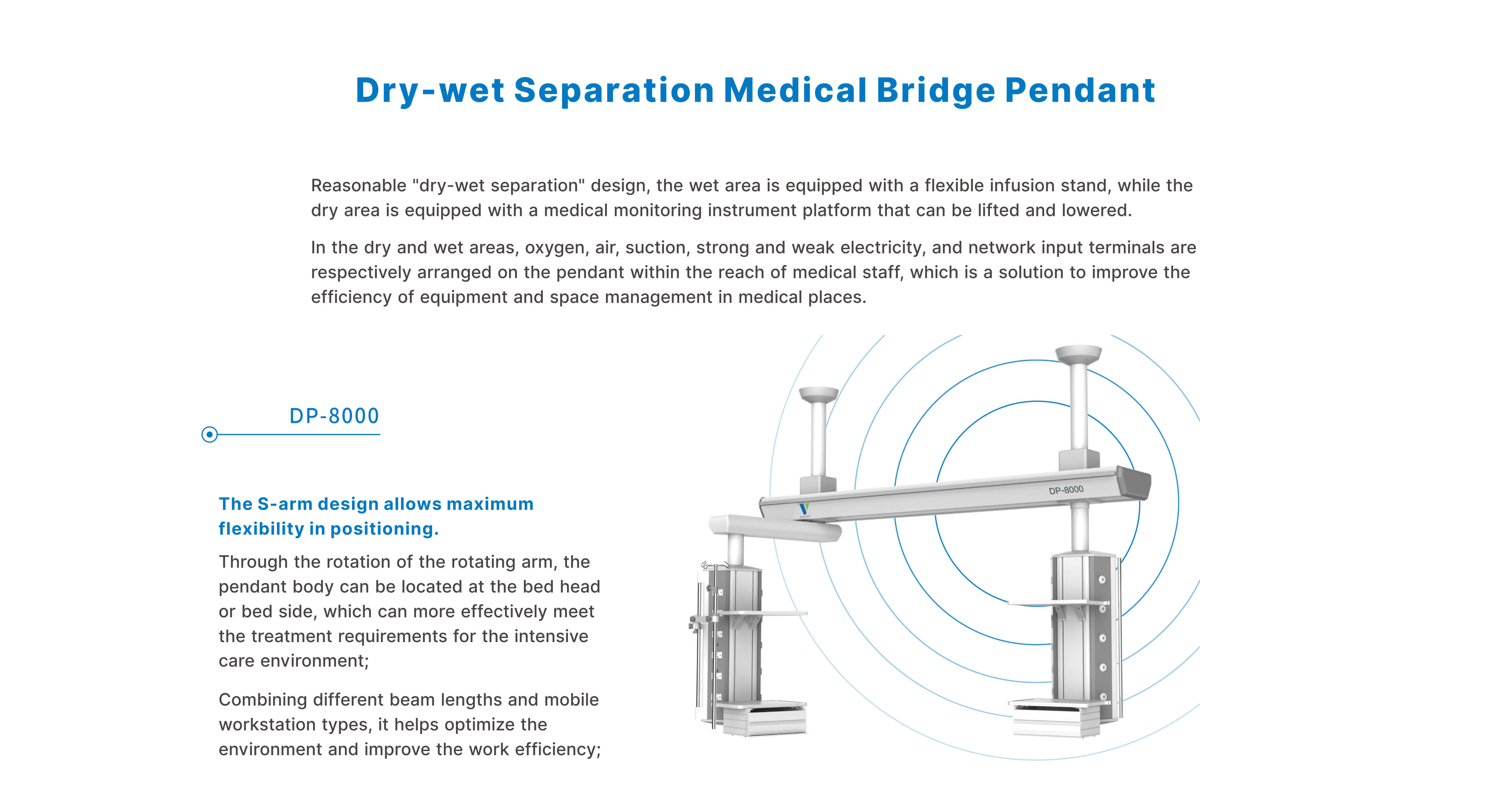 In the dry and wet areas, oxygen, air, suction, strong and weak electricity, and network input terminals are respectively arranged on the pendant within the reach of medical staff, which is a solution to improve the efficiency of equipment and space management in medical places.