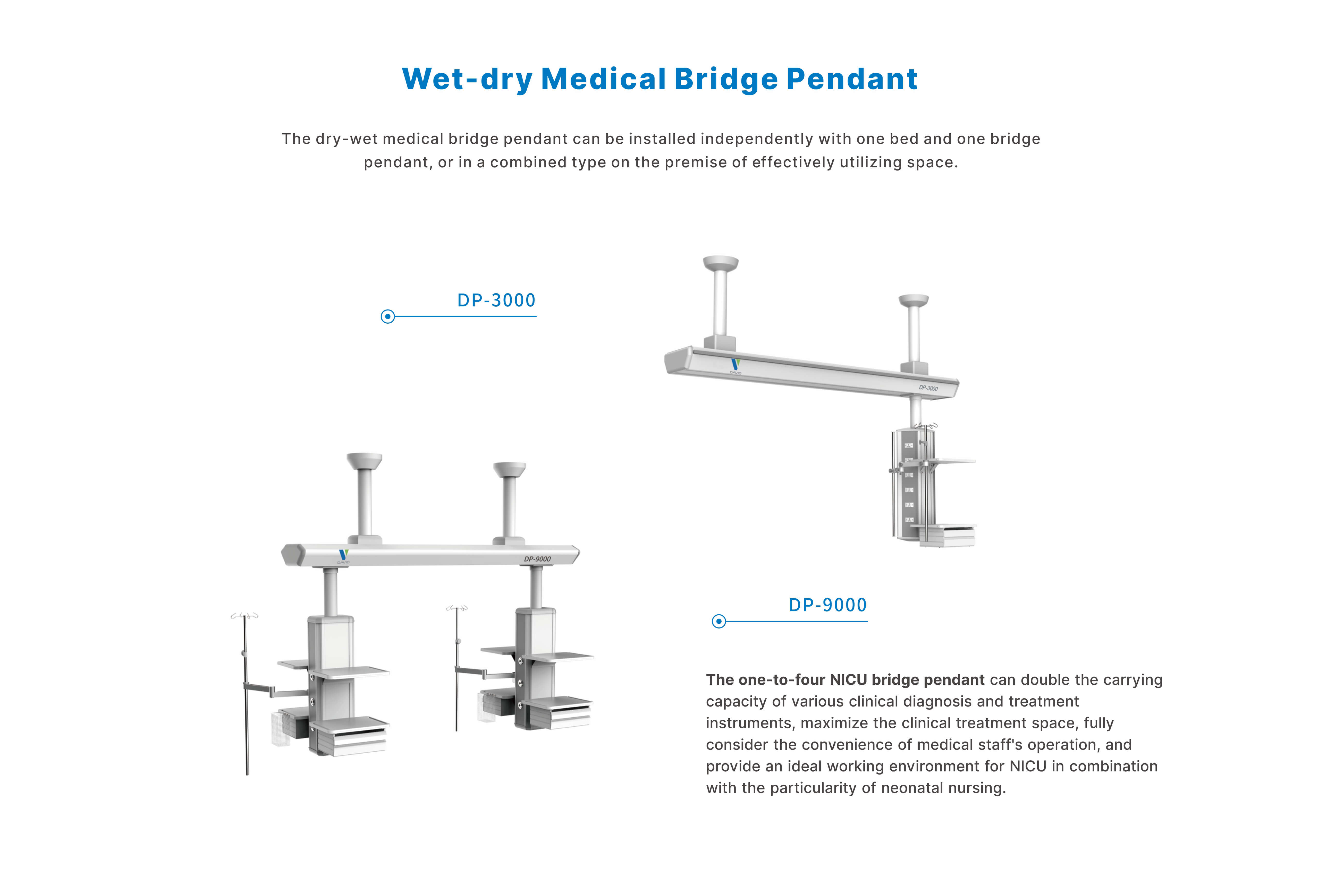 The dry-wet medical bridge pendant can be installed independently with one bed and one bridge pendant, or in a combined type on the premise of effectively utilizing space.