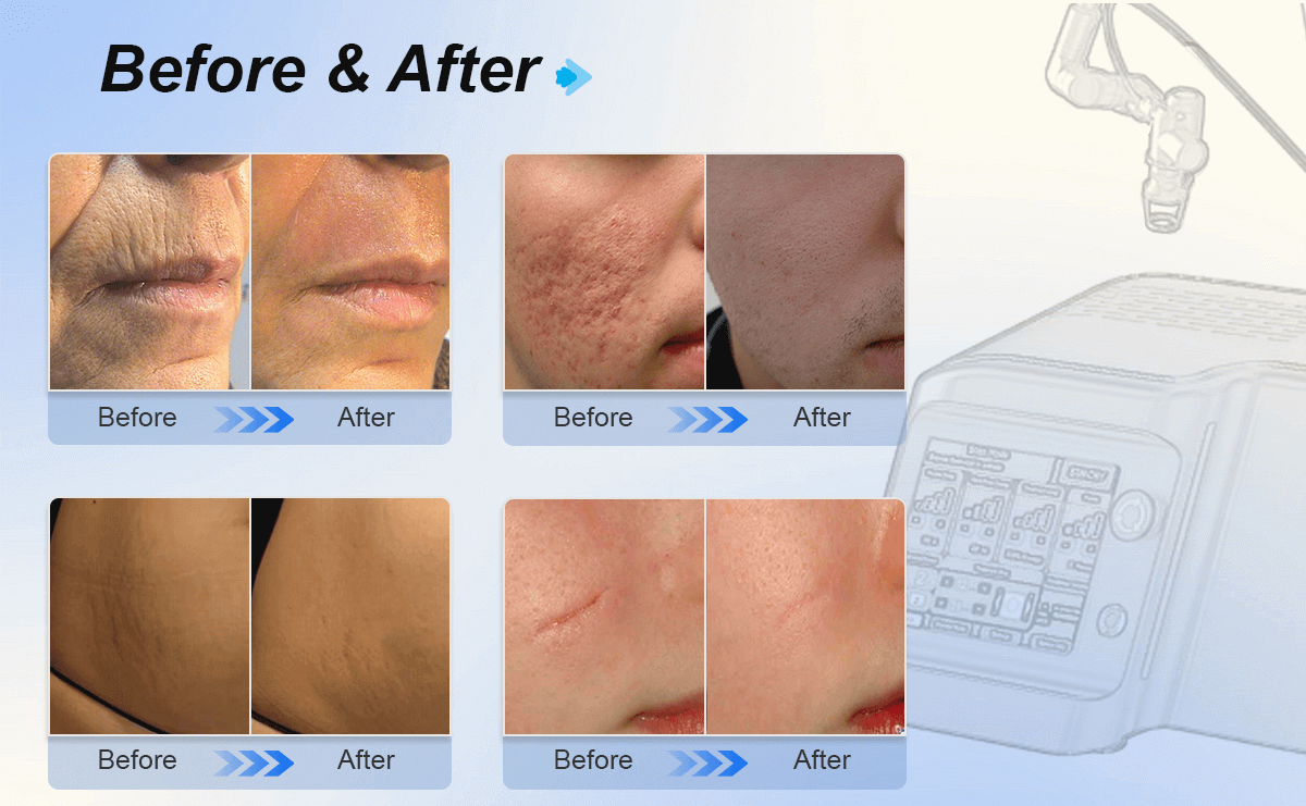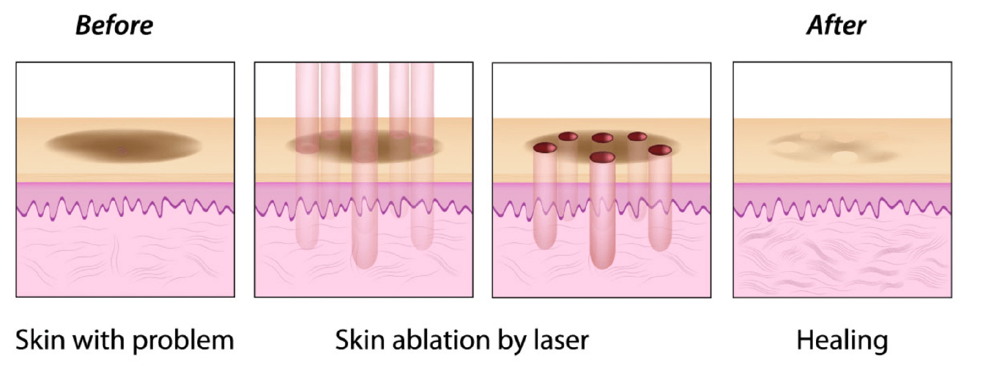 The CO2 laser beam heats and vaporizes the skin tissue , instantly removing the superficial layers of the skin. Each fractional micro spot creates a thermal zone. Intact cells around the treated area help the healing process . This process induces cell regeneration.