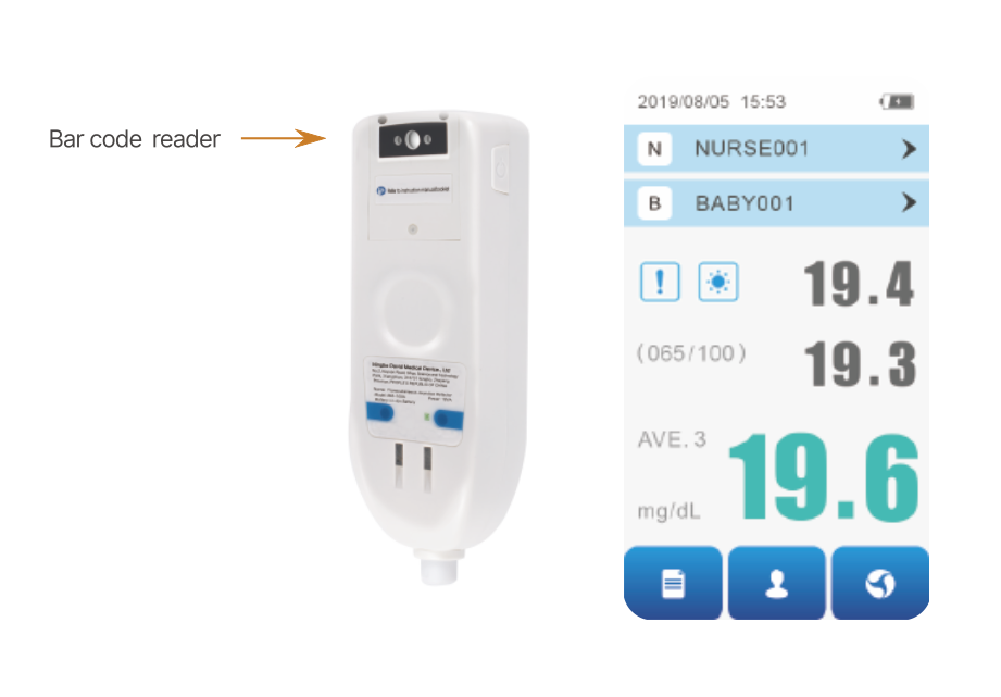 3) BM-100C: configured with bar code reader, by scanning QR and bar code, it can check or enter nurse and patient ID quickly and accurately; configured with micro USB data communication connector, can be connected with PC to transmit data, record and management are simple.