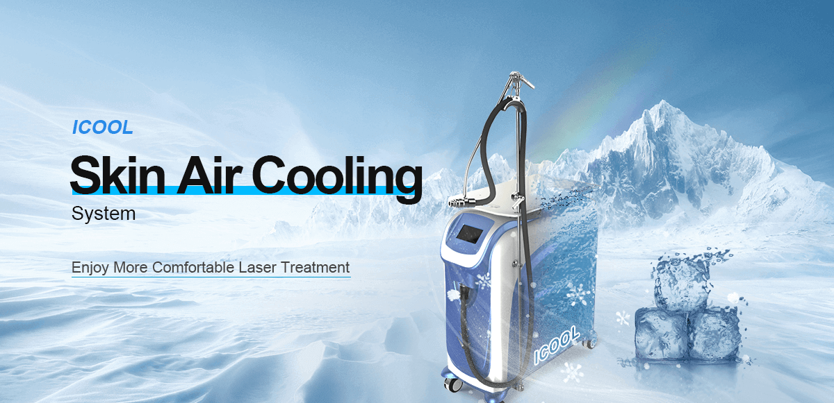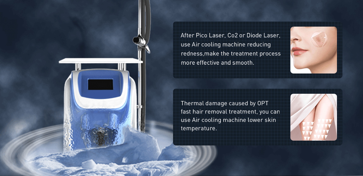 Skin Air Cooling is designed for reducing pains, redness, swelling and thermal damages caused by laser treatment, Intense Light (IPL) treatment and Radio frequency (RF) treatment .