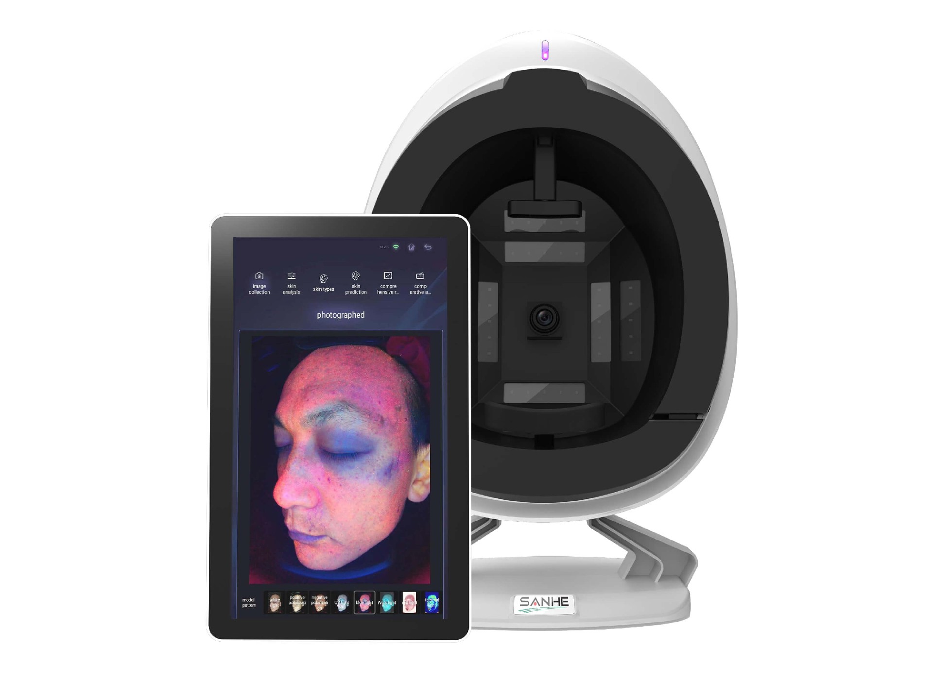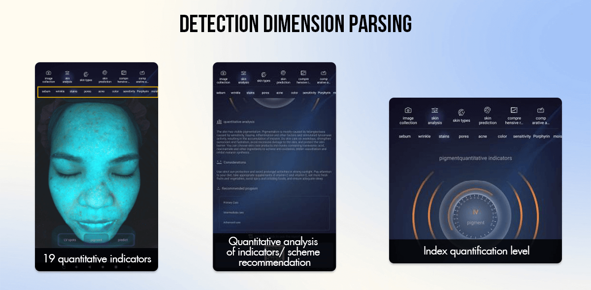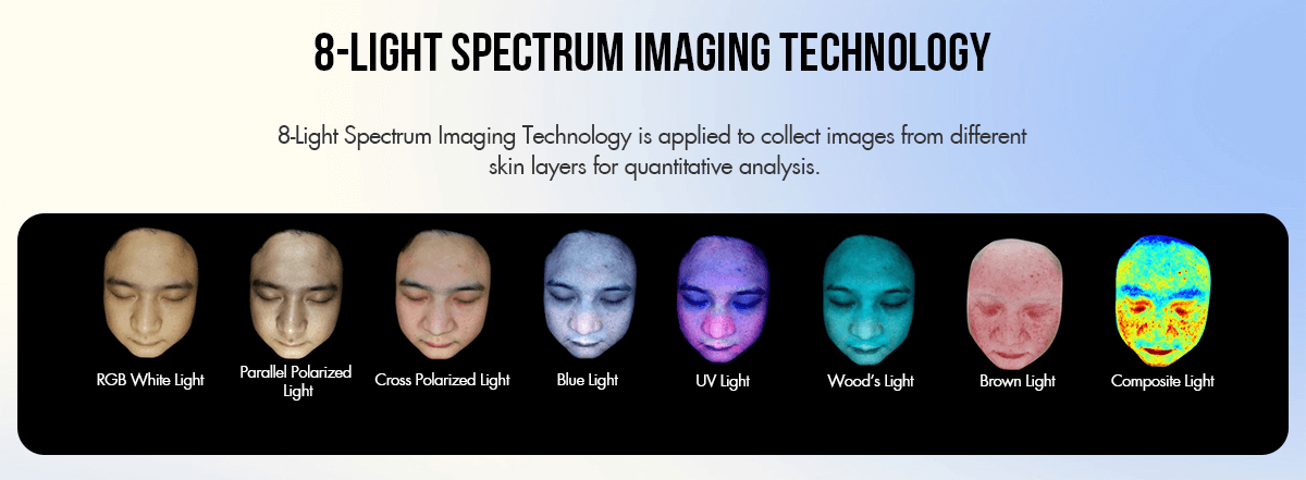 -RGB white light : In the state of natural light, sunlight is soft and uniform light, Use multi-directional diffused light to evenly illuminate the entire face without shadows and sharp lines, Can detect skin color status, can clearly see wrinkles, pores, pigmentation, acne. Clear representation of facial skin in natural sunlight as the basis for a holistic assessment of clinical skin.