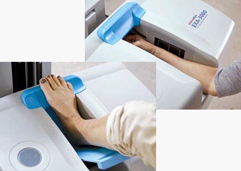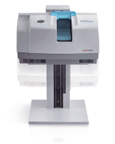 EXA-3000 is a peripheral Dual X-ray Absorptiometry (pDXA) device with its multi-site diagnosis function (forearm and calcaneus).