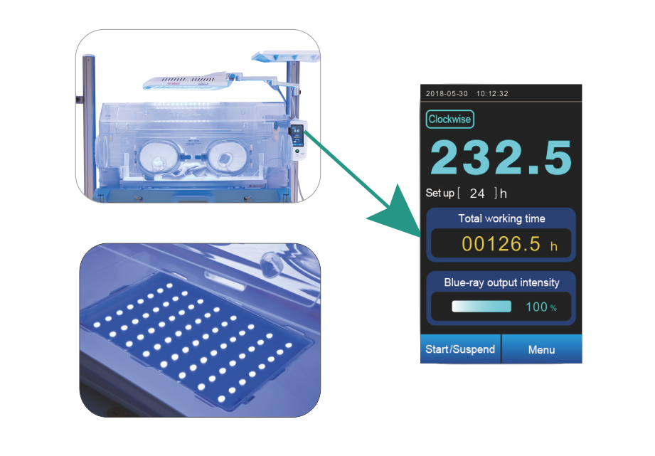 2) Upper phototherapy: full-touch visual operation, with two working modes: countdown and sequence; Use PWM control to achieve stepless adjustment of blue light brightness;