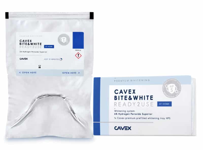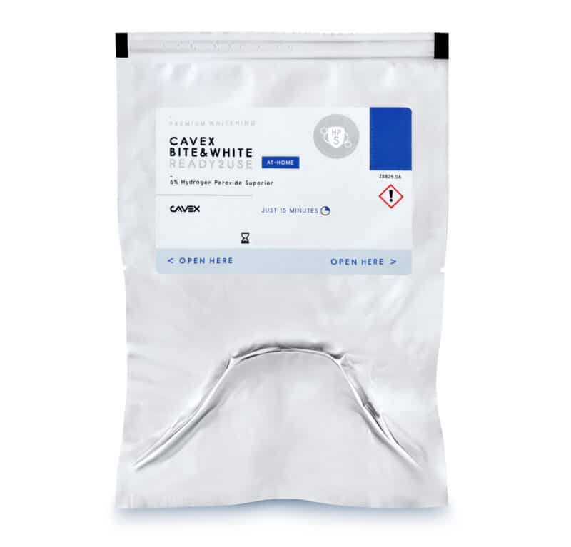 Cavex Bite&White Ready 2 Use is a professional, unique, quick, safe, and above all, easy to use whitening kit for at home. This second generation Ready 2 Use teeth whitening kit has been upgraded with Hydrogen Peroxide Superior (HPS) technology. Extremely quick and effective HPS gel boosts performance so a fantastic whitening result is reached after bleaching for just 8 days, 15 minutes per day. On top of that, this home whitening kit is immediately ready for usage and pH neutral.