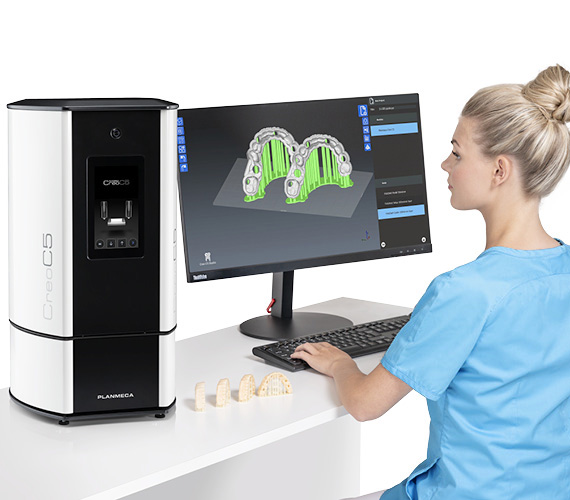 Add 3D printing to your dental manufacturing capabilities with Planmeca Creo® C5, a blisteringly fast 3D printer targeted specifically for dentistry. Planmeca Creo C5 enables fabricating individual dental applications, such as surgical guides, permanent and temporary restorations, dental models, aligner bases, night guards and indirect bonding trays easily and in a fraction of the usual time. Get the dental applications you need – when you need them.