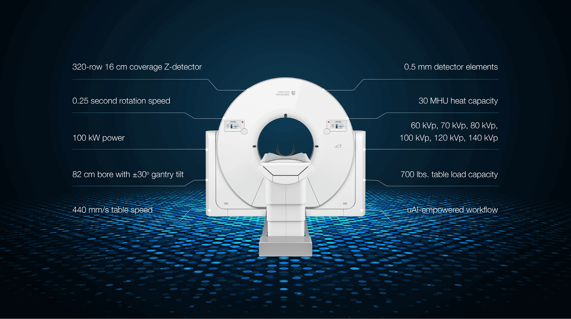 As an ultra-premium 640-slice CT scanner, uCT 960+ features 16 cm z-axis detector coverage, 0.25 s rotation speed, an ultra-wide 82 cm bore, and a 700 lbs. table weight capacity. Using industry-leading AI-empowered technologies, it launches the era of intelligent imaging, offering precise imaging and ease of use throughout the entire clinical spectrum.