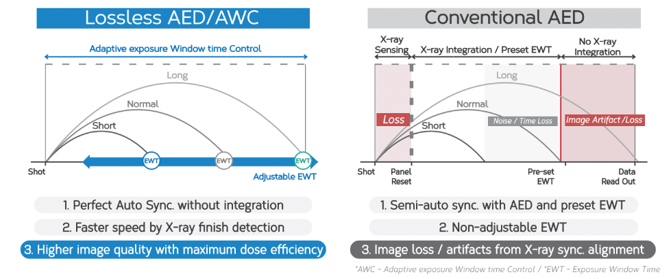- Loseless AED simultaneously performs X-ray sensing and integration, which ensures faster and more accurate AED operation.