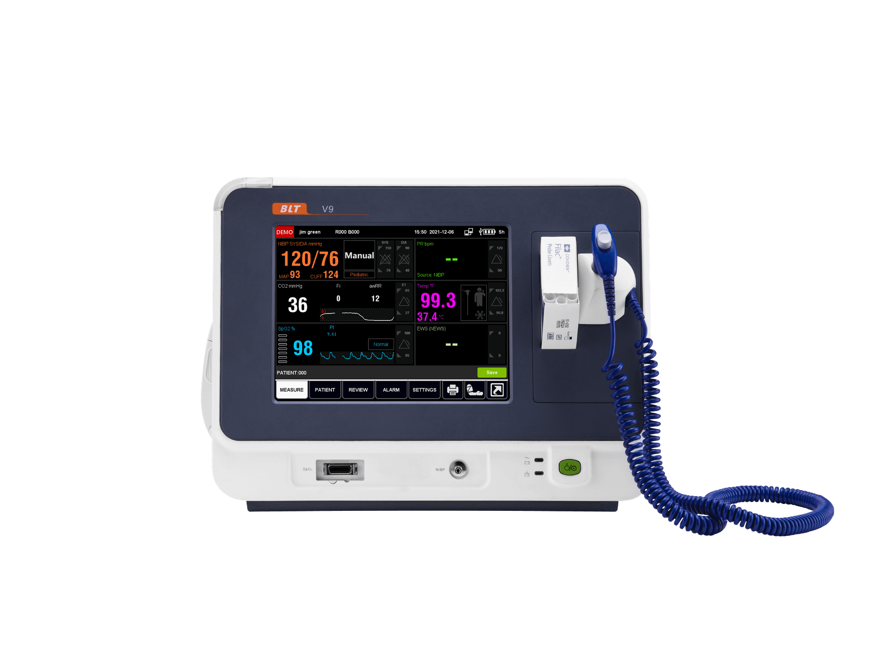 - V9 is an advanced vital signs monitor which offers pulse oximetry, blood pressure, temperature & EtCO2 measurements.