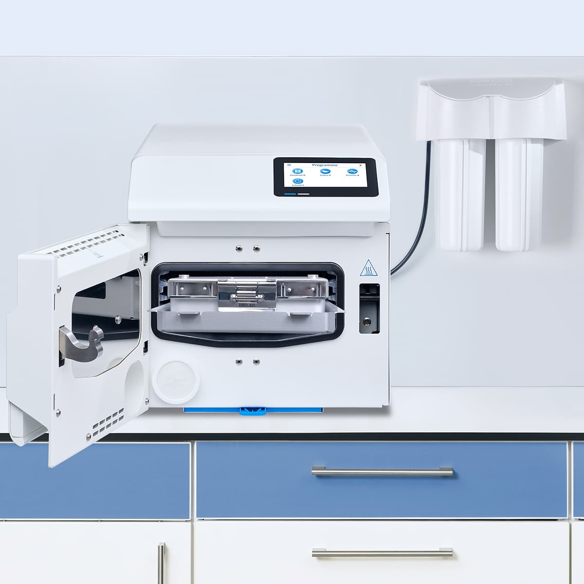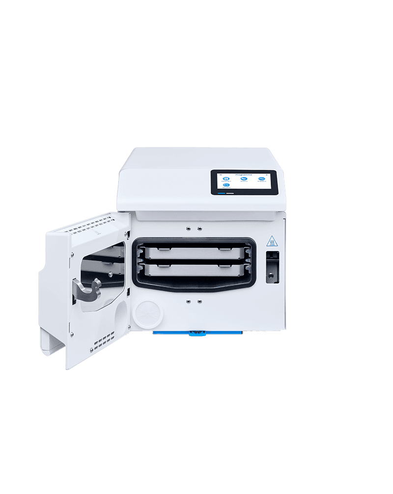 The powerhouse with a chamber volume of 5 liters is a compact class B autoclave that achieves great things: Because with a device width of just 30 cm, the fastest autoclave in its class fits into any reprocessing line: Either as a supplement to your practice autoclave for lightning-fast sterilization between treatments or as a stand-alone device for lower instrument volumes.