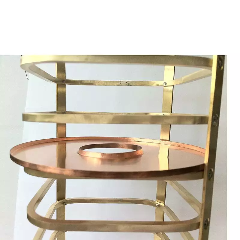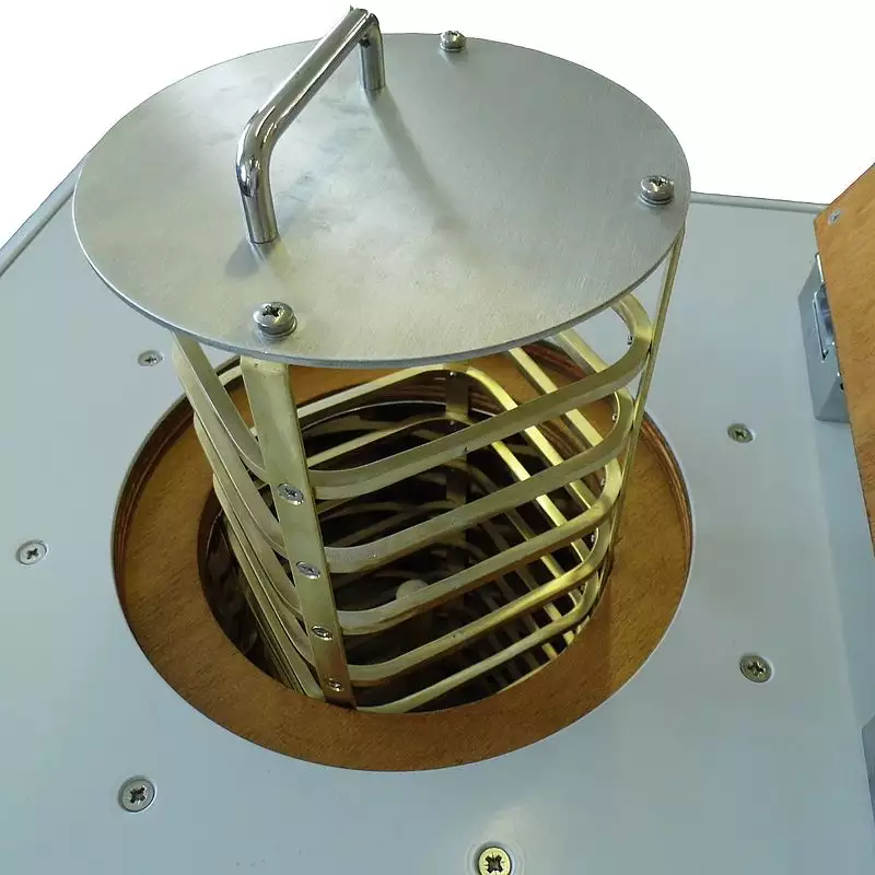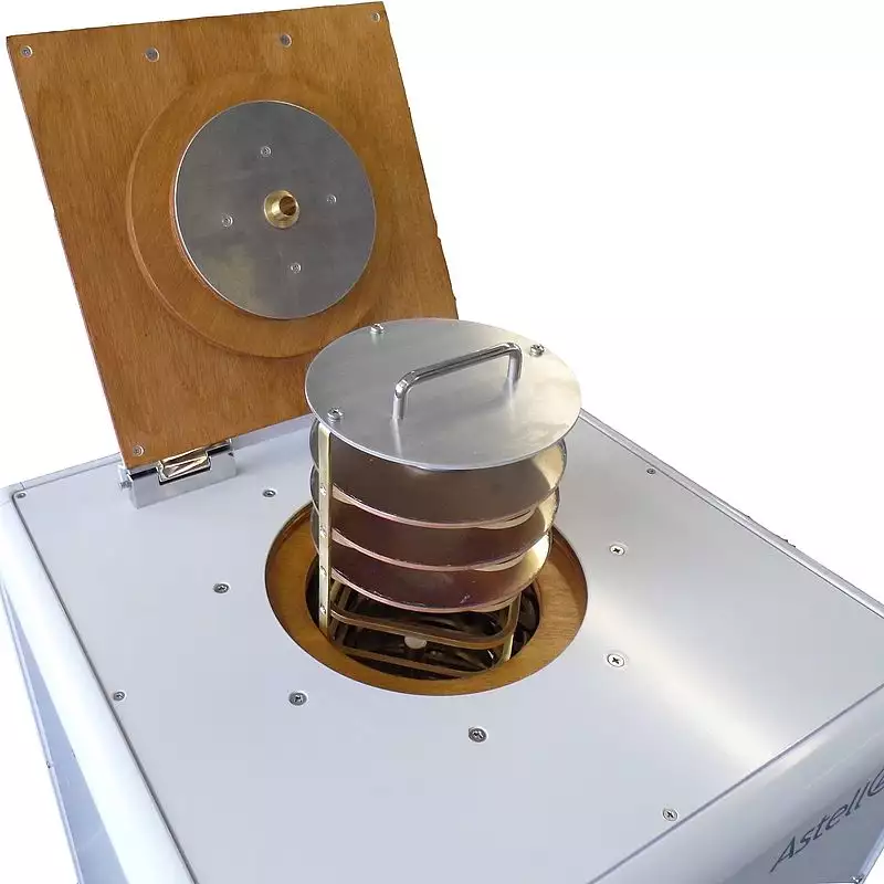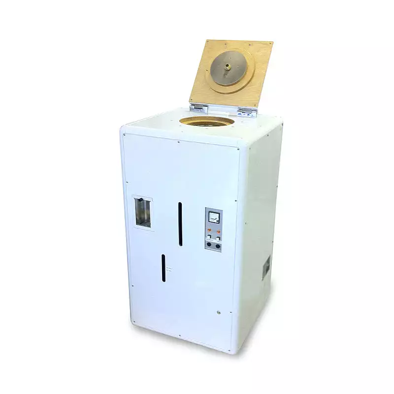 The unit comprises a cylindrical drying chamber in which is placed a stand carrying 12 circular copper trays; each tray is designed to take six stainless steel sample pans (TKE186). The top of the drying chamber is enclosed by a hinged insulated lid. In the centre of the chamber is an air distribution tube through which pre-heated air passes over the pans to facilitate the drying process.