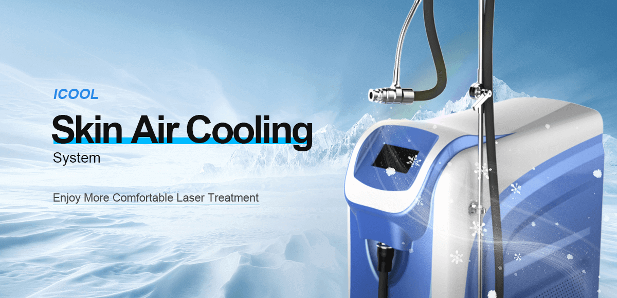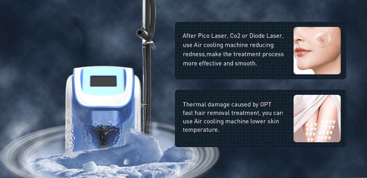 Skin Air Cooling is designed for reducing pains, redness, swelling and thermal damages caused by laser treatment, Intense Light (IPL) treatment and Radio frequency (RF) treatment .
