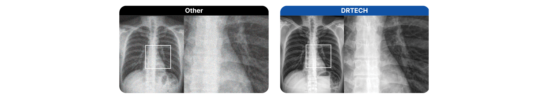 - DRTECH’s proprietary image processing technology, TRUVIEW ART, reduces light scattering that occurs in the indirect method where X-rays are converted into light, delivering clearer and sharper images. With over 30% improved spatial resolution compared to conventional systems, it offers outstanding diagnostic performance in detecting subtle lesions in the lungs, chest, and heart.
