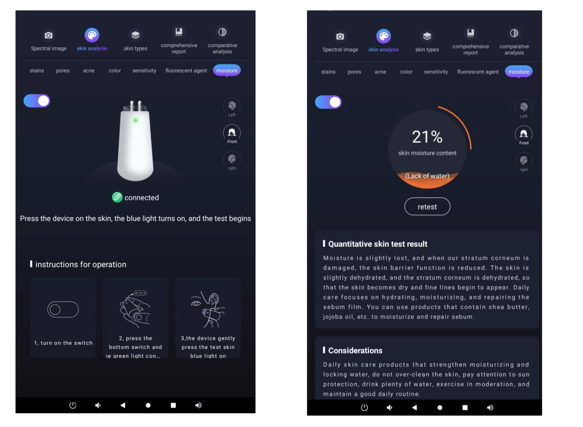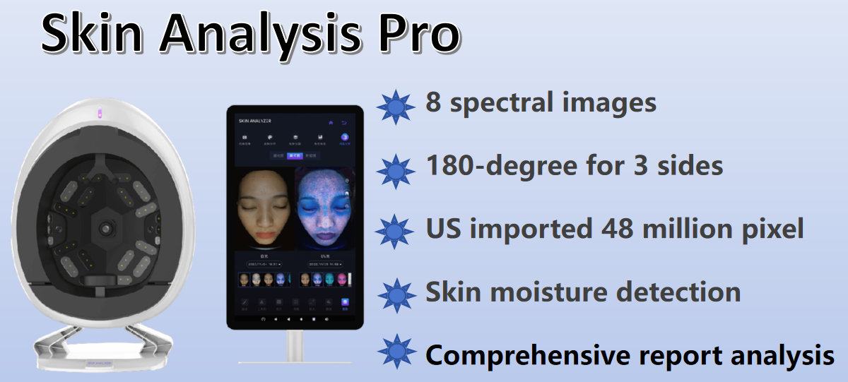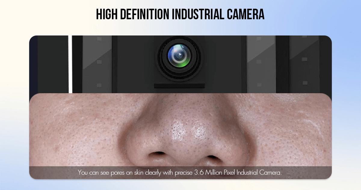 -RGB white light : In the state of natural light, sunlight is soft and uniform light, Use multi-directional diffused light to evenly illuminate the entire face without shadows and sharp lines, Can detect skin color status, can clearly see wrinkles, pores, pigmentation, acne. Clear representation of facial skin in natural sunlight as the basis for a holistic assessment of clinical skin.