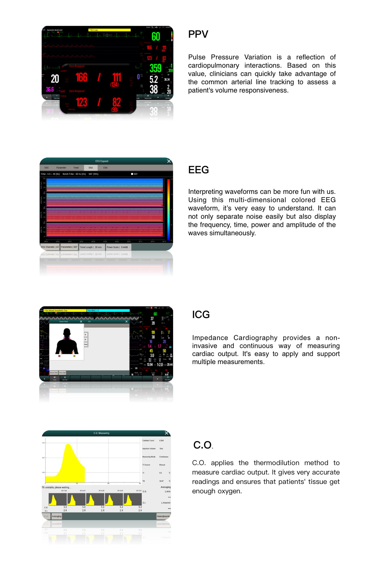 - compact : CO2, ECG, TEMP, RESP, respiratory rate, infusion rate, Oxy-CRG, heart rate, cardiac output, blood pressure, SpO2, NMT, EEG, pressure, impedance cardiography, BIS.