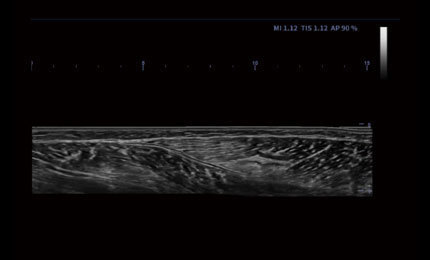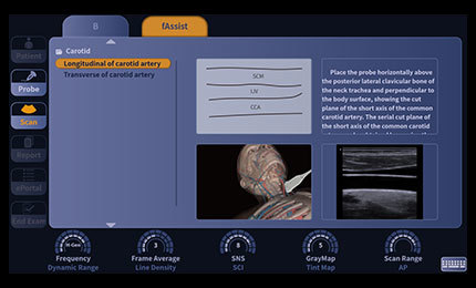 The image of the puncture needle is enhanced by the deflection of the acoustic beam, including needle enhancement, needle tip red rendering, virtual needle passage and scale line, supporting auto steering.