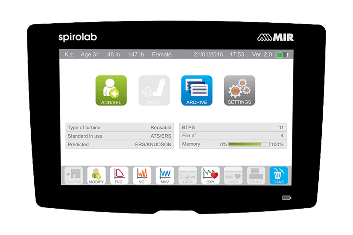 Real-time test displayed both on the device screen and on the PC via MIR Spiro Software Spirometry: FVC, VC, MVV, PRE/POST bronchodilator comparison Oximetry (optional): Spot test (SpO2%, BPM)