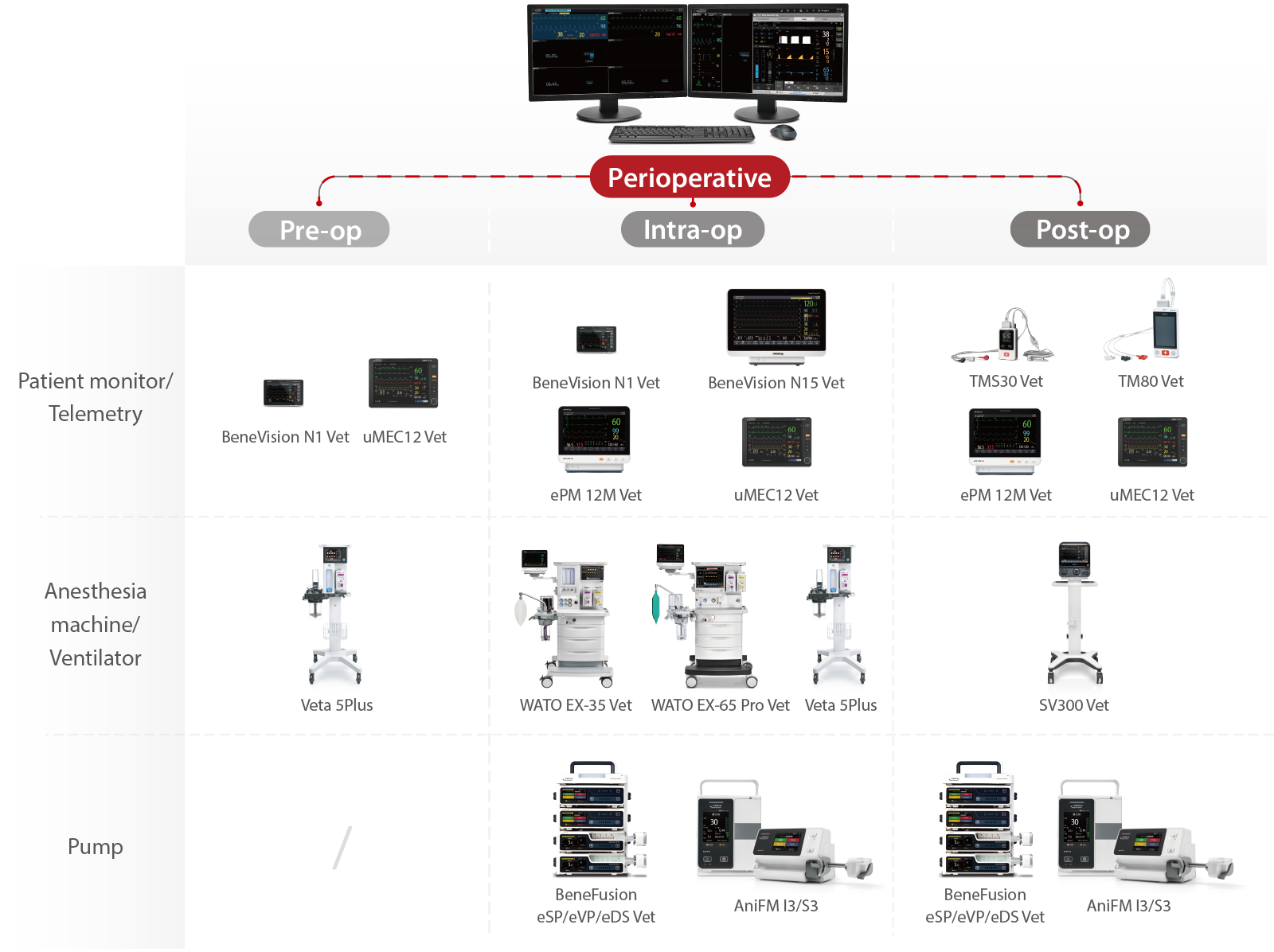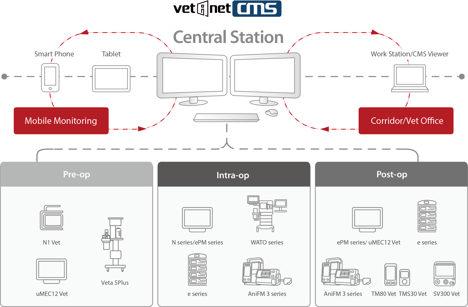 Synce:VetiNet CMS Central Monitoring System integrates a wide range of perioperative medical devices, including anesthesia machines, patient monitors, pumps, ventilators, and telemetry. VetiNet CMS supports up to 64 patients online simultaneously, with each patient configurable for 1 patient monitor, 1 anesthesia machine, and up to 8 pumps — meeting the diverse needs of veterinary hospitals and clinics.