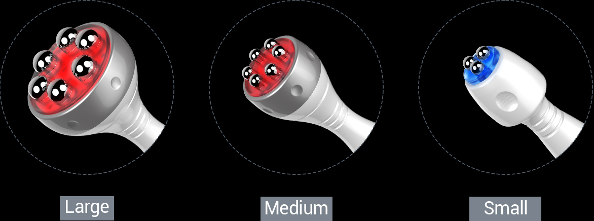-3 size of handpieces allows to treat various areas from the face to the whole body