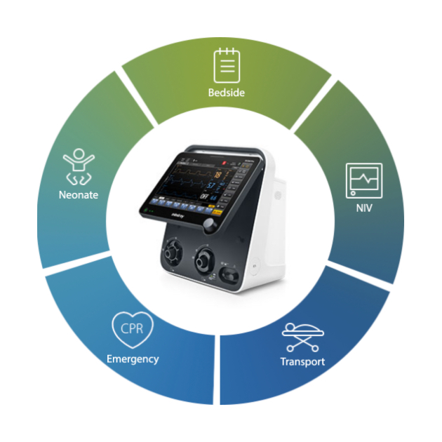 With a weight no more than 10kg, equipped with powerful turbine and integrated CO₂/SpO₂ monitoring, the SV300 Pro is appropriate for all levels of patient acuity and in all care settings, from the patient's bedside to another point of care with its intra-hospital transport friendly designs.