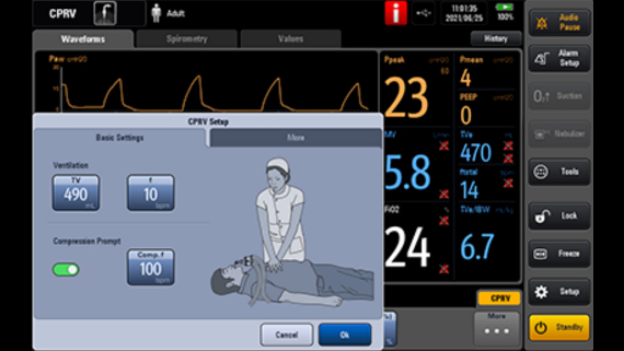 CPRV TM is specially developed for CPR procedure. Quickly access the mode with one-click start, allowing precision ventilation and CO2 monitoring. When used with Mindray unique Electronic Impendence Threshold Device(e-ITD TM ) technology, it can further improve the efficacy of CPR with increase venous return and perfusion.