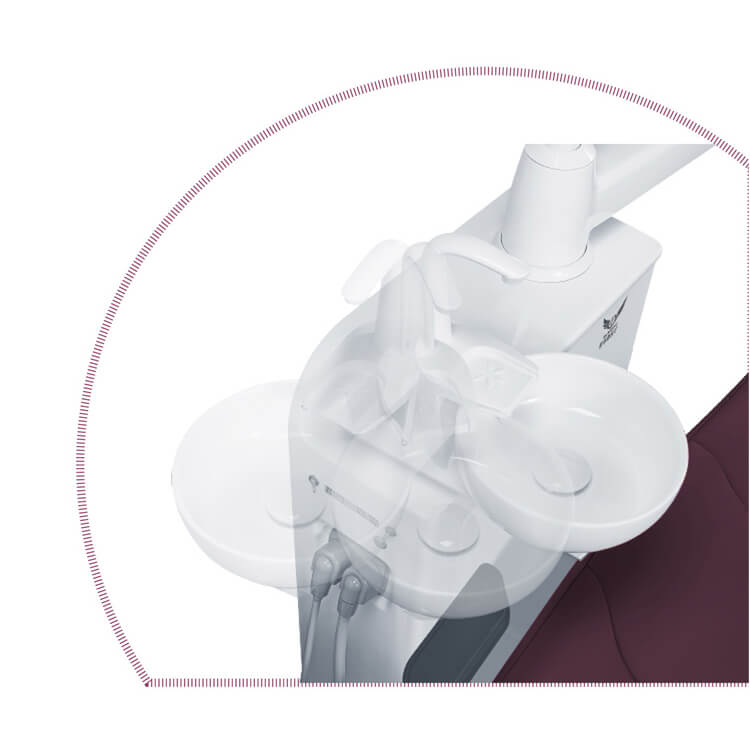 The ceramic spittoon is located on the main unit and can be rotated freely in the operating area to facilitate the patient’s mouth wash.