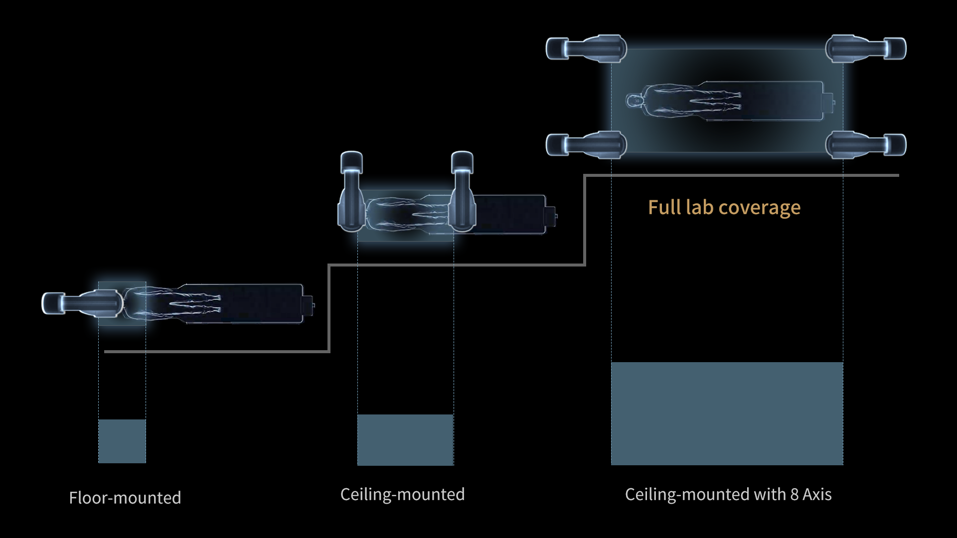 Conventional floor-mounted interventional systems have a limited range of motion and cover only a specific area. Ceiling-mounted interventional systems provide more movement but are confined to a longitudinal direction. The uAngio AVIVA system, with its innovative 8th axis, unlocks lateral movement, enabling coverage of the entire lab space. This enhanced flexibility distinguishes the uAngio AVIVA as a truly advanced robotic system.