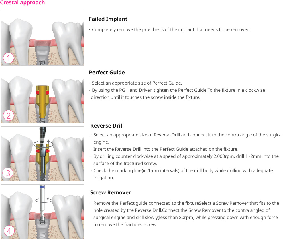 Remove the Perfect guide connected to the fixtureSelect a Screw Remover that fits to the hole created by the Reverse Drill.Connect the Screw Remover to the contra angled of surgical engine and drill slowly(less than 80rpm) while pressing down with enough force to remove the fractured screw.