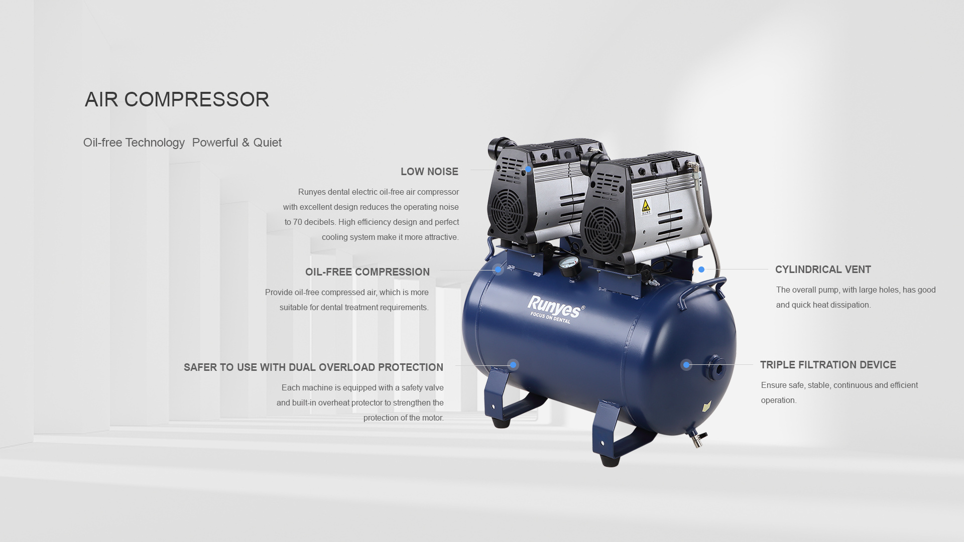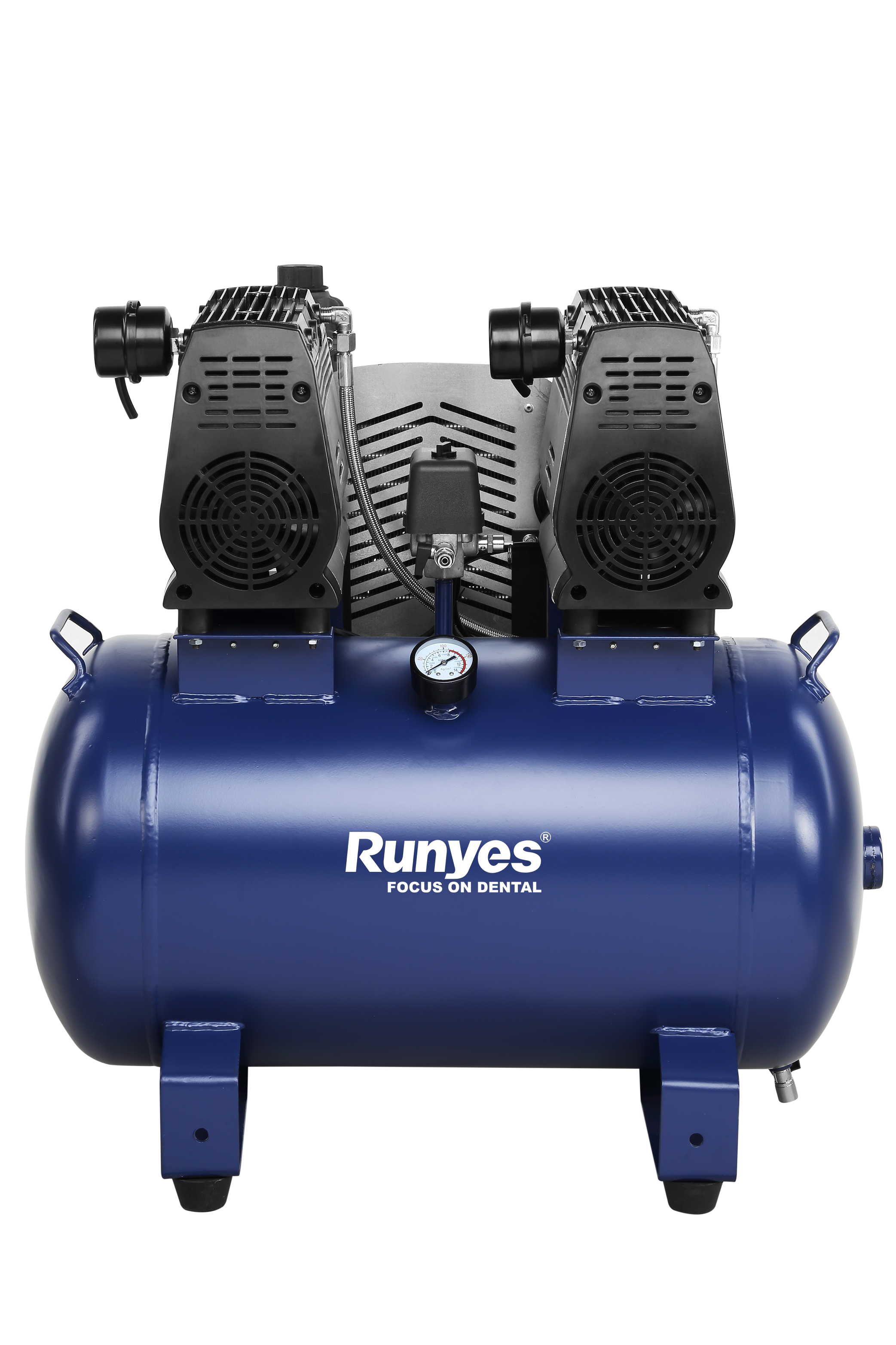 Runyes dental electric oil-free air compressor with excellent design reduces the operating noise to 70 decibels. High efficiency design and perfect cooling system make it more attractive.