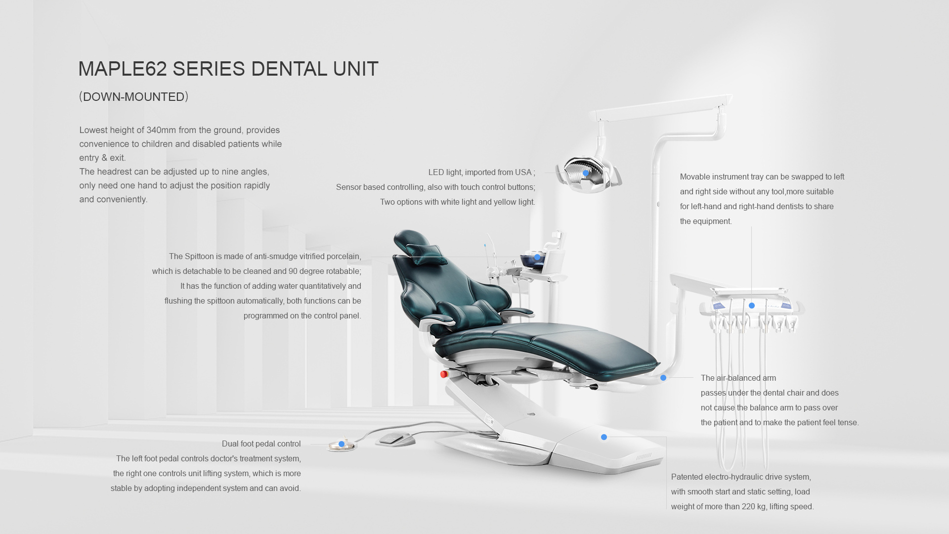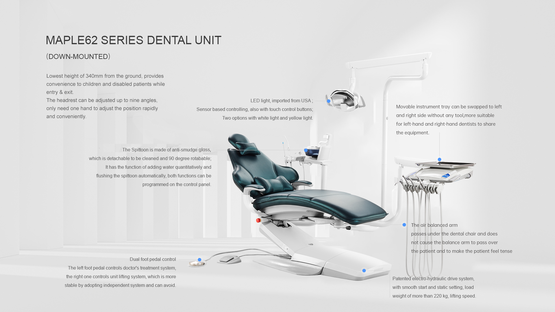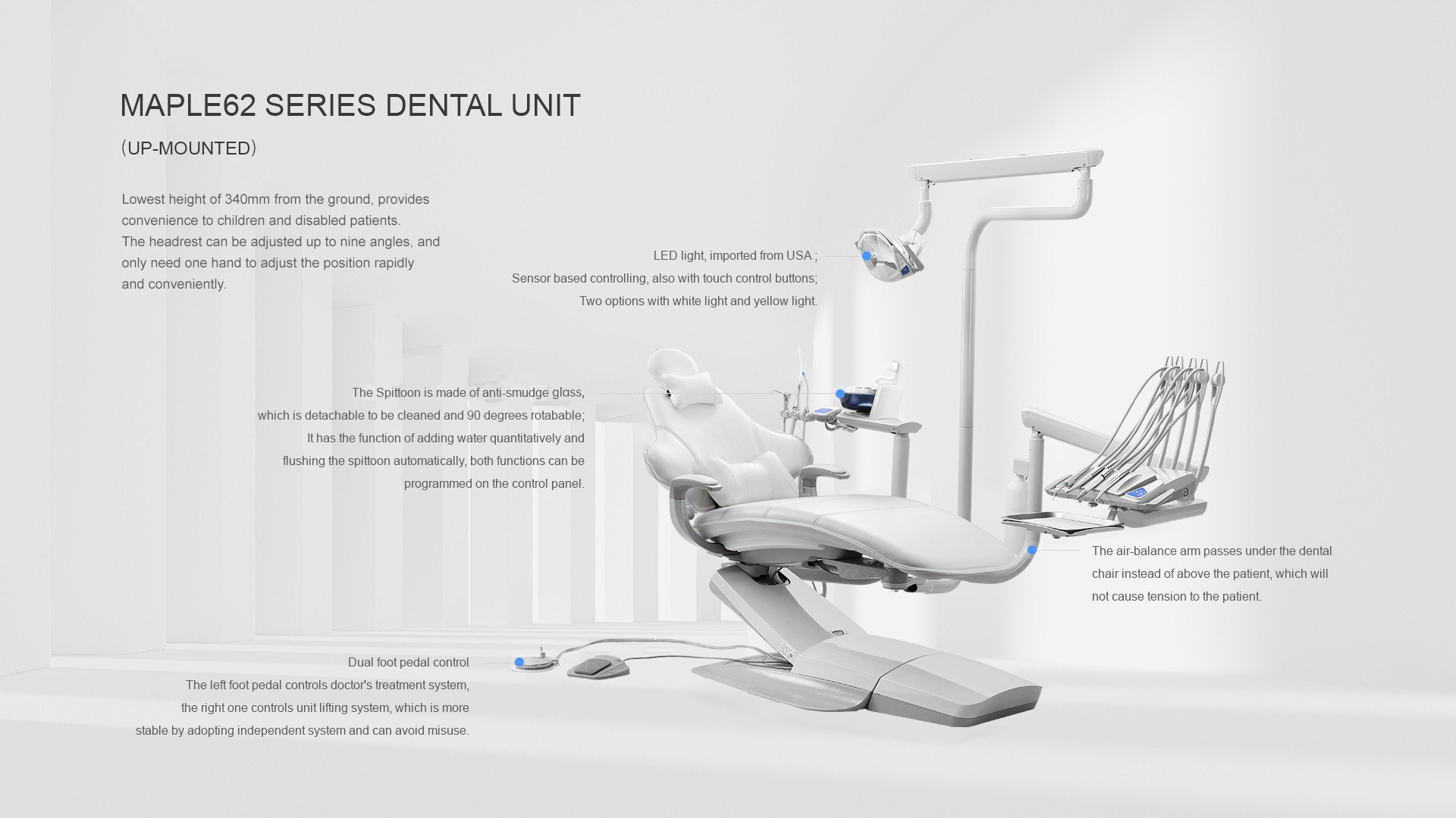 -The air-balance arm passes under the dental chair instead of above the patient, which will not cause tension to the patient.