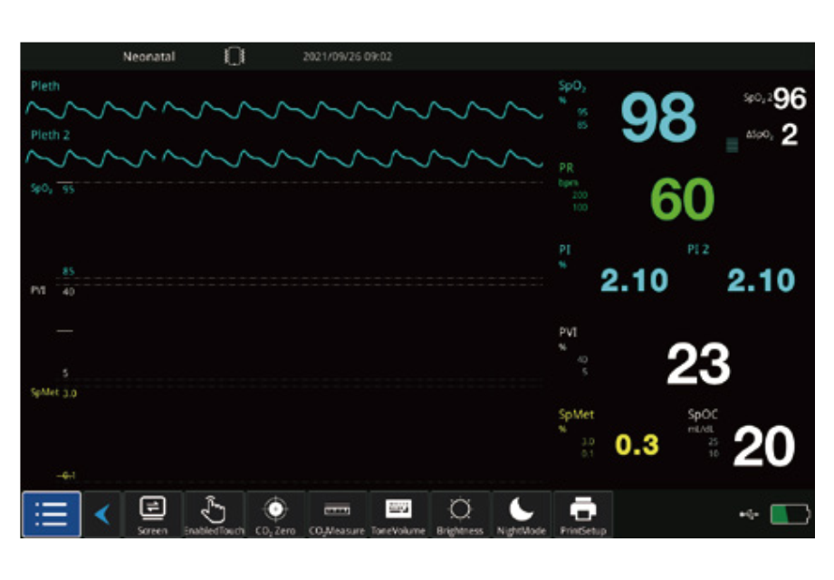 Optional dual blood oxygen function, simultaneously monitor and display different SpO2 values of neonate's either hand and either foot.