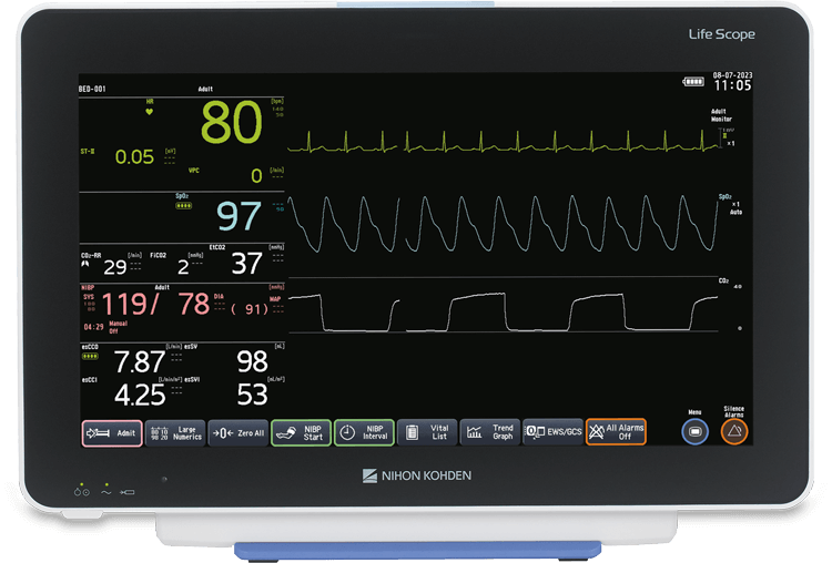 - A large numeric screen makes it possible to check the patient's vital data from a distance.