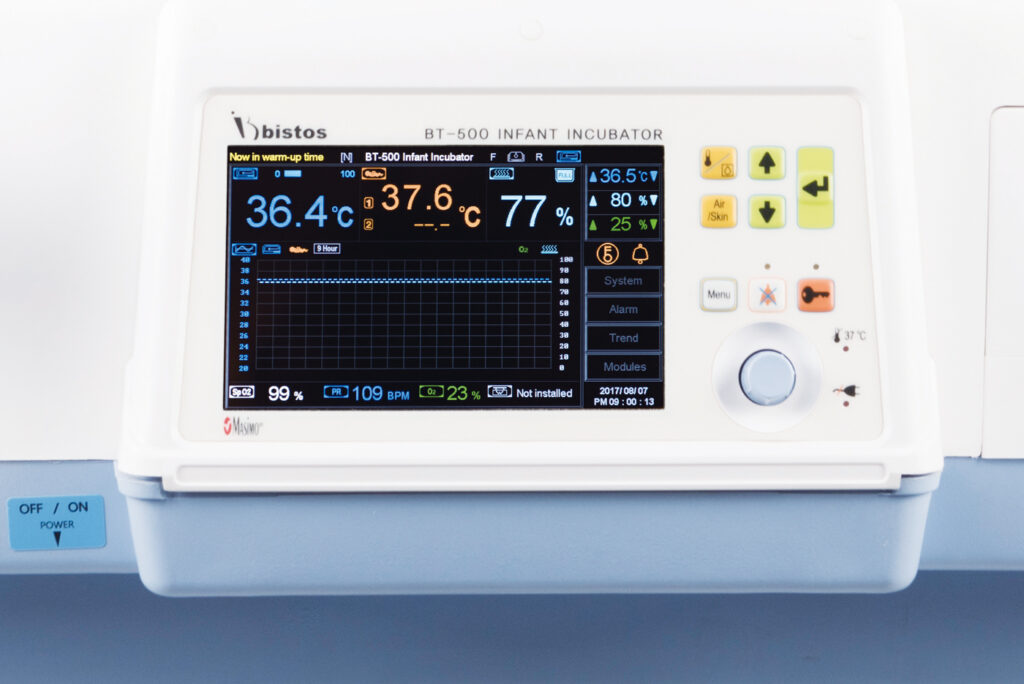 The Bistos BT-500 is an FDA registered infant incubator, which can precisely control temperature and humidity with low noise providing the best environment for the recovery of neonatal patients. Also, CCD Camera enables remote monitoring of neonate, and in-built SpO2 monitor and weighing scale provide total monitoring of neonate. The unit has ergonomic design.