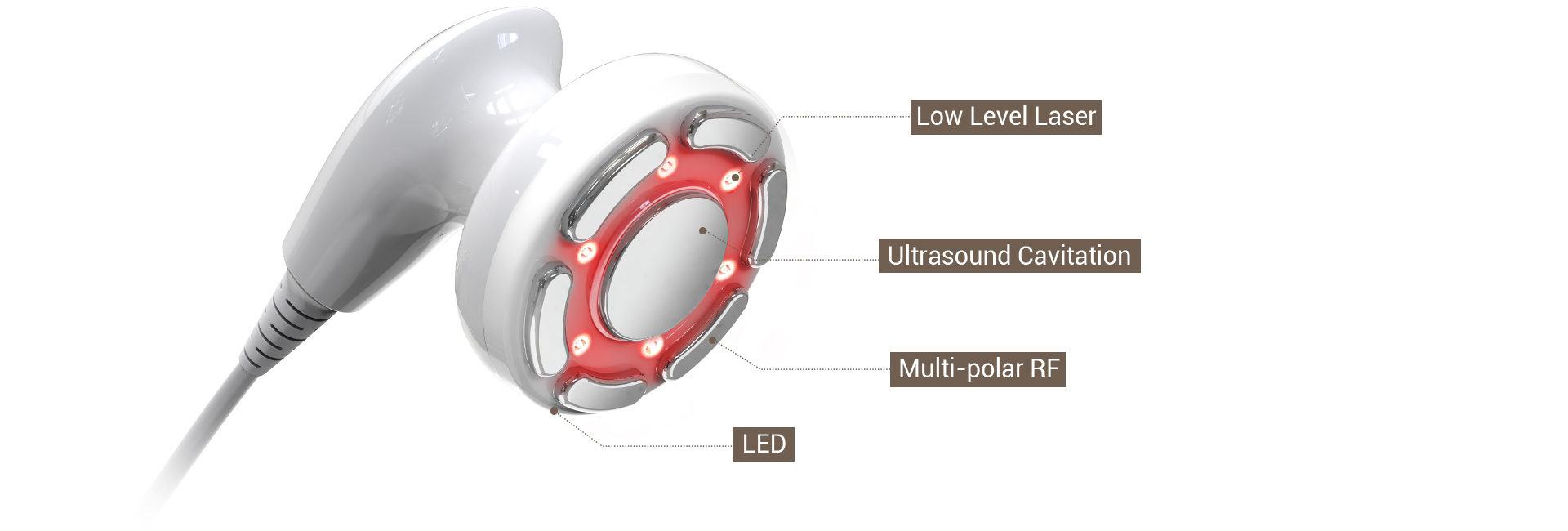 Combination of Multi-polar RF, Cavitation, Low Level Laser & LED maximizes fat cell reduction, cellulite reductionas well as elasticity improvement.