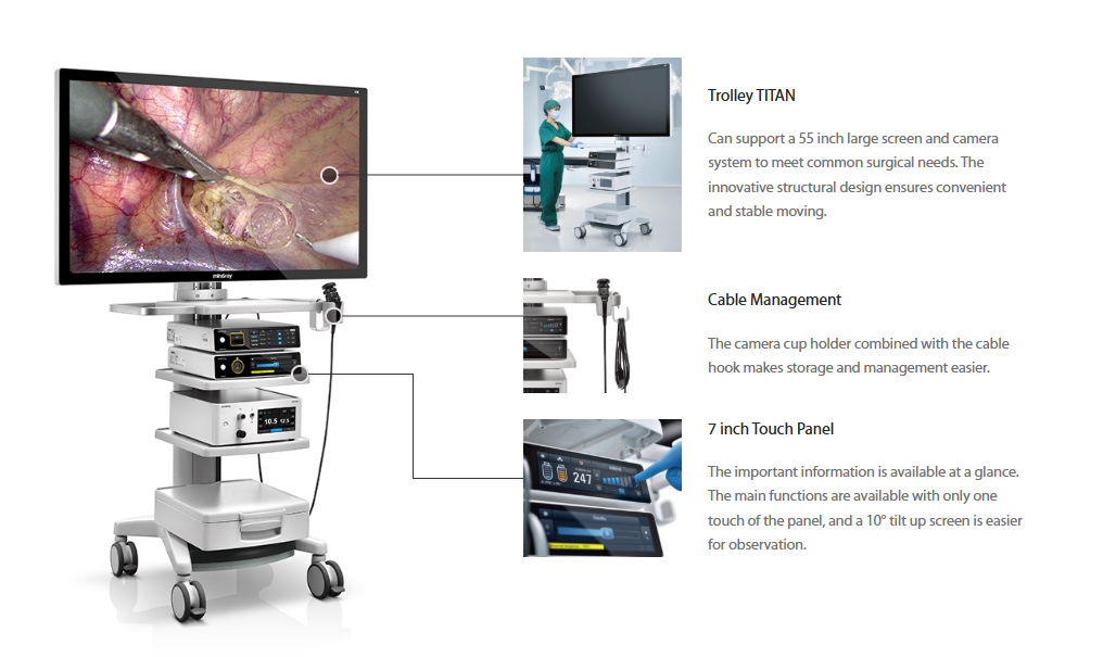 A Titan Trolley stand with a 55inch large screen and camera system together to meet common surgical needs. The innovative structural design ensures convenient and stable moving
