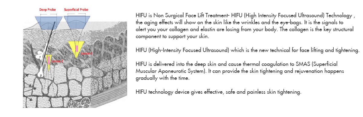 HIFU is Non Surgical Face Lift Treatment- HIFU (High Intensity Focused Ultrasound) Technology , the aging effects will show on the skin like the wrinkles and the eye-bags. It is the signals to alert you your collagen and elastin are losing from your body. The collagen is the key structural component to support your skin. HIFU (High-Intensity Focused Ultrasound) which is the new technical for face lifting and tightening. HIFU is delivered into the deep skin and cause thermal coagulation to SMAS (Superficial Muscular Aponeurotic System). It can provide the skin tightening and rejuvenation happens gradually with the time. HIFU technology device gives effective, safe and painless skin tightening.