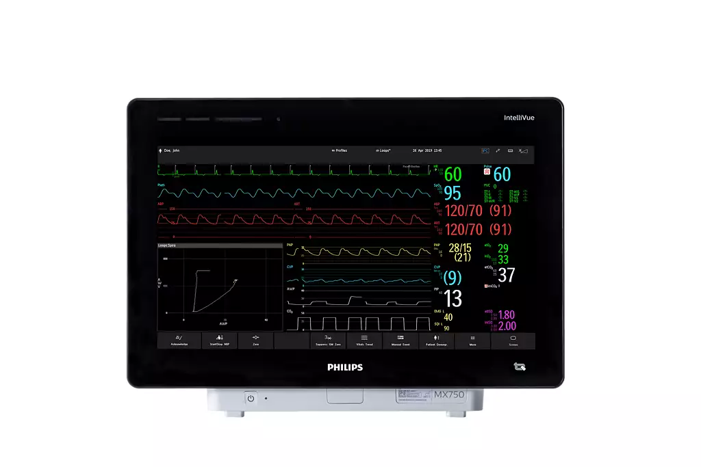 IntelliVue AD85 Active Display provides an independent display with real-time guaranteed alarming capability for use with specific IntelliVue monitors.The IntelliVue AD85 Active Display contains an optically bonded 22" (547 mm) LCD (TFT)display with predicted capacitive (pCap) touch technology, within a housing similar to MX750 patient monitor. The IntelliVue AD85 Active Display connects to a host monitor via a LAN connection. The display provides 4 USB ports for connecting USB HID compatible pointing devices. The front of the display has a built-in Contactless ID and Communication device utilizing RFID technology. When connected to a patient monitor, the IntelliVue AD85 Active Display can show the same number of waveform channels as the monitor itself. When mounted close to the monitor, the alarm sounds on the display can be disabled. When mounted remotely the patient monitor in the room can be silent, while IntelliVue AD85 Active Display takes over the sounding of alarms.
