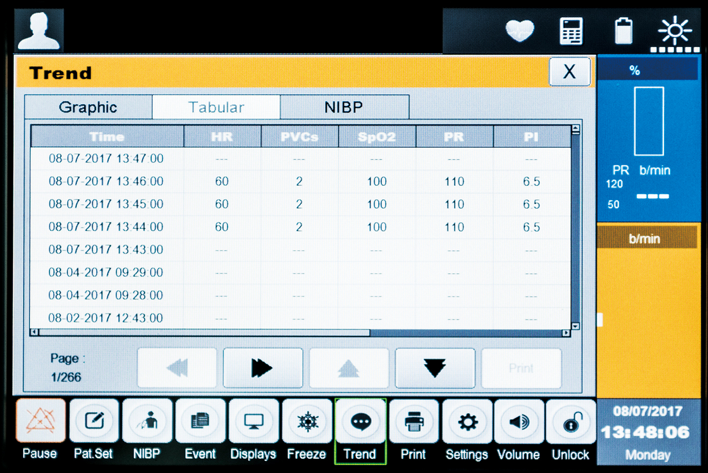 - ECG, Resp., SpO2, NIBP, Temp., CO2, IBP, Multi-gas, CO, Masimo SpO2