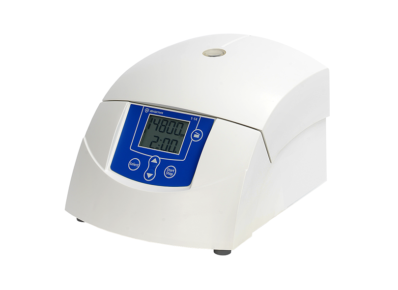 Two fixed-angle rotors provide a maximum capacity of 24 x 1.5/2.0 ml. Thanks to rotors for PCR strips, microhaematocrit capillary tubes and filter tubes, the Sigma 1‑14 is an all-round laboratory centrifuge suitable for a wide variety of applications. It is popular for molecular biology applications such as DNA, RNA and protein isolation, clinical chemistry, and in research labs and food labs, universities, and the pharmaceutical industry.