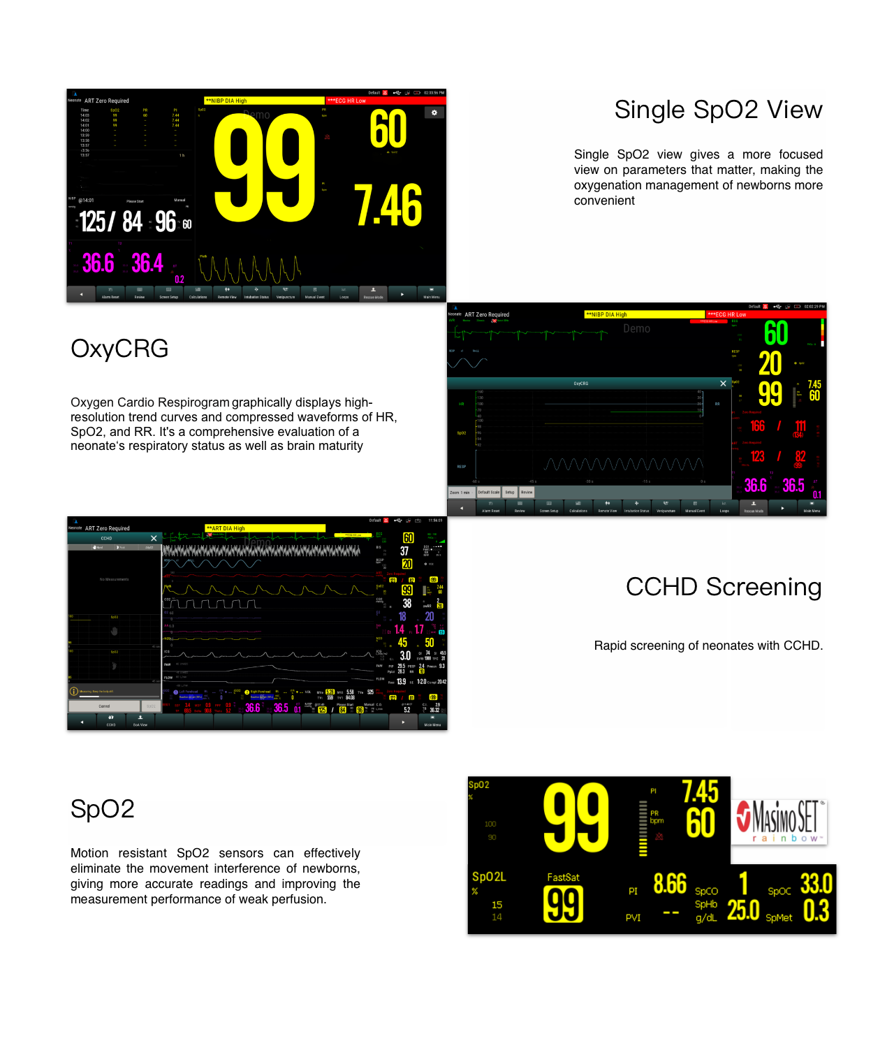 - Oxygen Cardio Respirogram graphically displays high- resolution trend curves and compressed waveforms of HR, Sp02, and RR. It's a comprehensive évaluation of a neonate's respiratory status as well as brain maturity