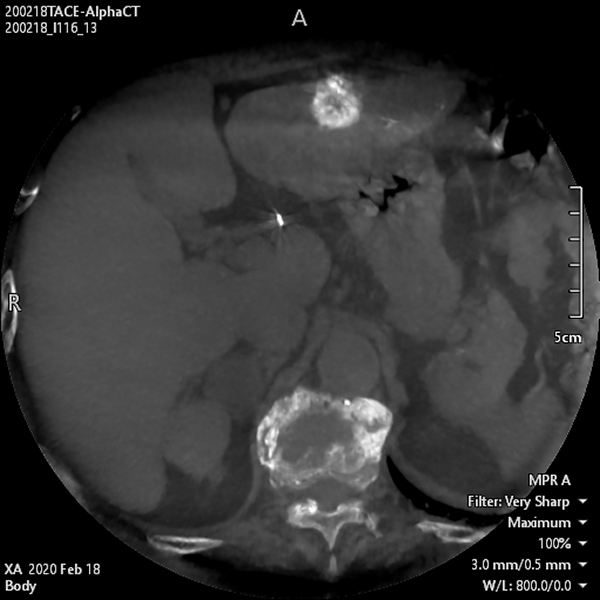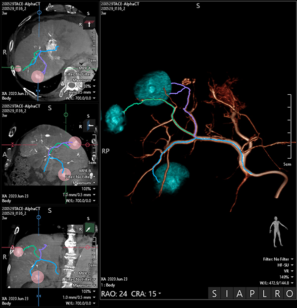 Comprehensive planning tools allow for quick and intuitive analysis prior to embolization procedures. Using 3D volume data to select the tumor and define the corresponding feeding vessels, this information as an overlay can be viewed during live fluoro of the procedure. In multi-phase Alpha CT, visualization of contrast media corresponds to arterial, venal and capillary blood flow providing valuable insight in identification of hepatic tumor feeding vessels.