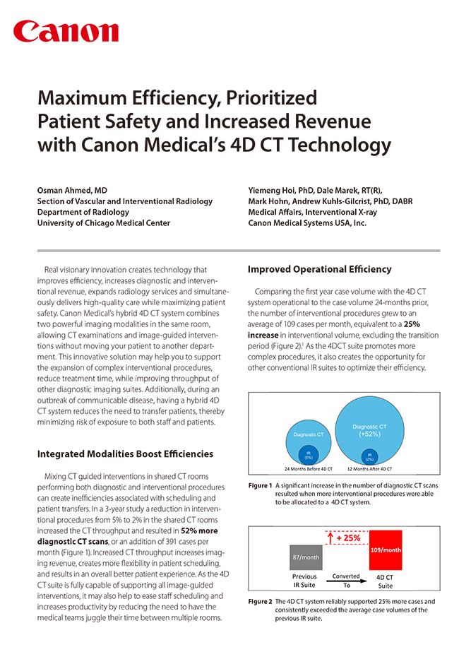 Discover how one prestigious IR site used 4D CT to improve efficiency, increase revenue, and expand their radiology services, while simultaneously delivering high-quality care to maximize patient safety.