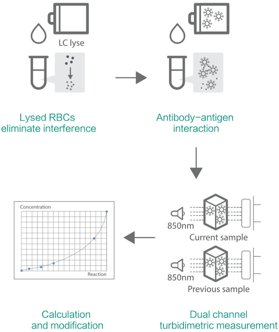 Advanced and proven Latex Immunoturbidimetric technology plus two reagents can well guarantee the analyzing accuracy in fast dual-channel CBC+DIFF+CRP test.