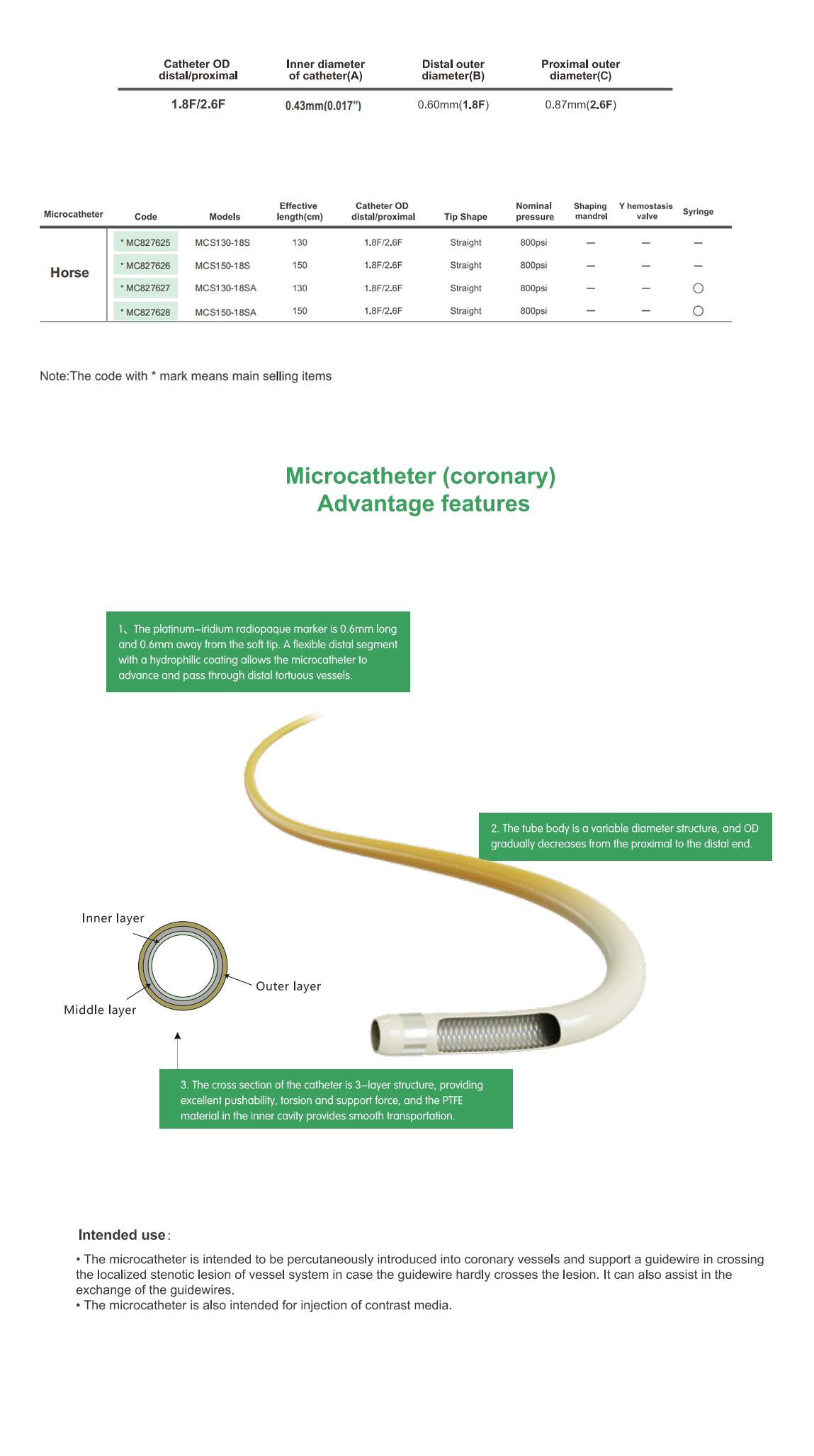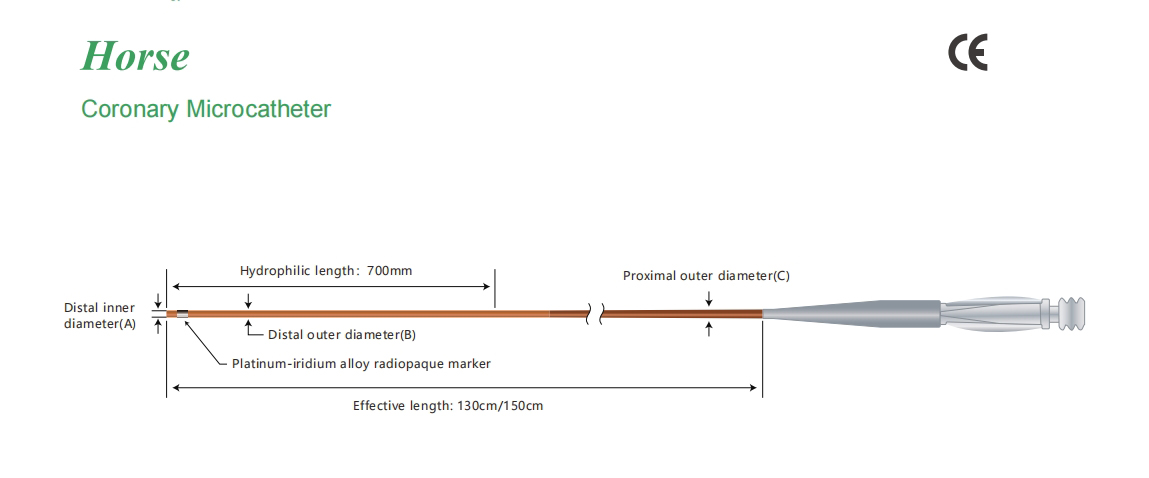 1. The platinum-iridium radiopaque marker is 0.6 mm long and 0.6 mm away from the soft tip. A flexible distal segment with a hydrophilic coating allows the microcatheter to advance and pass through distal tortuous vessels.